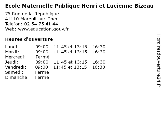 1 Ecole Elementaire Publique Henri et Lucienne Bizeau (Distance: 0,00 km) 75 Rue de la République, 41110 Mareuil-sur-Cher bizeau, cours, ecole, education, elementaire, et, henri, lucienne, publique, services, école, élémentaire 2 Dr Paul-Henri Dujardin - Médecin généraliste (Distance: 14,92 km) 371 Rue du Général de Gaulle, 41400 Saint-Georges-sur-Cher docteur, dr, dujardin, generaliste, généraliste, henri, medical, médecin, paul, soin 5 Monsieur Claude Bizeau (Distance: 33,95 km) 22 Rue Du Petit Chambord, 41350 Vineuil bizeau, claude, restaurants 6 École maternelle publique Jeanne et Henri Vrillon (Distance: 35,72 km) 4 Route D Orchaise, 41190 Molineuf cours, et, henri, jeanne, maternelle, publique, services, vrillon, école |