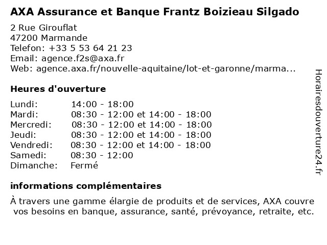 1 AXA Assurance et Banque Frantz Boizieau Silgado (Distance: 18,90 km) 1 Avenue Maurice Dubois, 47120 Duras assurance, assurance appartement, assurance auto, assurance entreprise, assurance epargne, assurance habitation, assurance maison, assurance professionnelle, assurance santé, assurance voiture, axa, banque, boizieau, et, frantz, silgado 2 Axa Assurance (Distance: 0,02 km) 2 Rue Girouflat, 47200 Marmande assurance, assurance prêt, assurances, axa, services 3 Axa Assurance (Distance: 1,07 km) 22 Marmande, 24500 Eymet assurance, assurance prêt, assurances, axa, services 4 Axa Assurance (Distance: 1,07 km) 9 Boulevard Meyniel, 47200 Marmande assurance, assurance prêt, assurances, axa, services 5 Caisse Primaire d'Assurance Maladie (CPAM) (Distance: 1,51 km) 13 Rue du Docteur Courret, 47200 Marmande administration, assoc, caisse, cpam, d'assurance, maladie, primaire, services, services publics 6 GMF Assurance (Distance: 1,68 km) 36 Boulevard Raymond Fourcade, 47200 Marmande agence, agent, assurance, auto, gmf, habitation, prévoyance, santé |