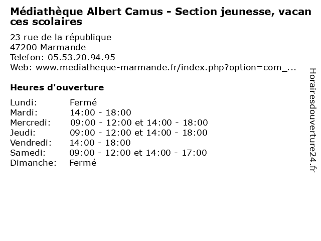 1 Médiathèque Albert Camus - Sections Adultes/adolescents/salle d'étude (Distance: 0,00 km) 23 rue de la république, 47200 Marmande adultes/adolescents/salle, albert, bd, camus, d'étude, livres, livres en gros caractères, médiathèque, revues, sections 2 Médiathèque Albert Camus - Section jeunesse, hors vacances scolaires (Distance: 0,00 km) 23 rue de la république, 47200 Marmande albert, bd, camus, hors, jeunesse, livres, livres en gros caractères, médiathèque, revues, scolaires, section, vacances 3 Médiathèque Albert Camus - Espace Multimédia (Distance: 0,00 km) 23 rue de la république, 47200 Marmande albert, bd, camus, espace, livres, livres en gros caractères, multimédia, médiathèque, revues 4 Musée Albert Marzelles (Distance: 0,16 km) 15 rue Abel Boyé, 47200 Marmande albert, exposition, marzelles, musée, visite 5 Centre aquatique Aquaval - Piscine à Marmande (Vacances scolaires (hors vacances d'été) ) (Distance: 1,41 km) - Rue portogruaro, 47200 Marmande aquatique, aquaval, centre, d'été, hors, marmande, natation sportive, piscine, scolaires, sportif, vacances 6 Parra Albert (Distance: 9,13 km) Lieu Dit Francois, 47180 Castelnau Sur Gupie albert, parra, restaurants |