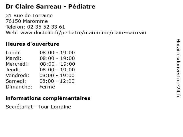 1 Dr Claire Sarreau - Pédiatre (Distance: 7,08 km) 7 Boulevard de l'Europe, 76100 Rouen bebe, claire, clinique, dr, mathilde, nourisson, pédiatre, pédiatrie, rouen, sarreau 2 Dr Bénédicte Blanc - Pédiatre (Distance: 0,00 km) 31 Rue de Lorraine, 76150 Maromme blanc, bénédicte, docteur, dr, generaliste, medical, pédiatre, soin 3 Dr Caroline Aize-Hautefeuille - Pédiatre (Distance: 0,00 km) 31 Rue De Lorraine, 76150 Maromme aize, caroline, dr, enfant, hautefeuille, pediatre, pédiatre, sante, soins 4 Claire-Marine Sassolas - Ostéopathe (Distance: 1,97 km) 2 allée Fauvettes, 76960 Notre-Dame-De-Bondeville claire, marine, osteopathe, osteopathie, osteopraticien, ostéopathe, sassolas 5 Claire Donront - Sage-femme (Distance: 2,81 km) 6 Parc de la Varenne, 76130 Mont-Saint-Aignan claire, consultation, docteur, donront, dr, femme, med, médecin, médecine, sage, secrétariat, traitement 6 Claire Donront - Sage Femme (Distance: 3,13 km) 6 boulevard Siegfried, 76130 Mont-Saint-Aignan accouchement, cabinet, claire, consultation, donront, femme, sage |