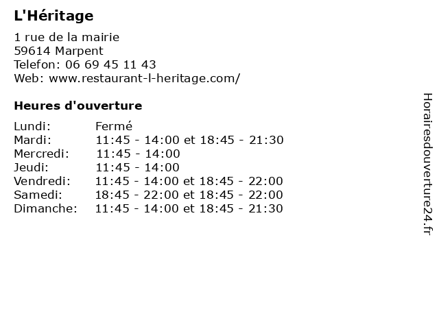 1 Forge De L'héritage (Distance: 12,88 km) 6 Rue de l'Église, 59227 Verchain-Maugré de, forge, l'héritage 2 Restaurant l'Héritage (Distance: 46,57 km) 1 rue de la Mairie, 59164 Marpent jeumont, l'héritage, marpent, restaurant |