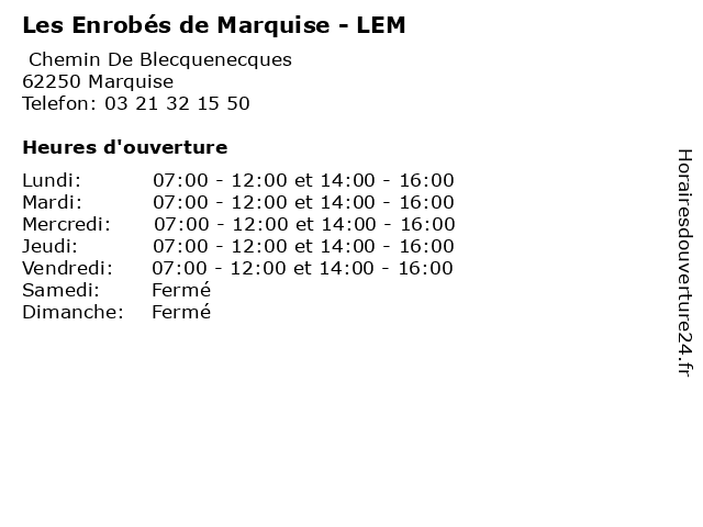 | Mercredi | 07:00-12:00 et 14:00-16:00 |