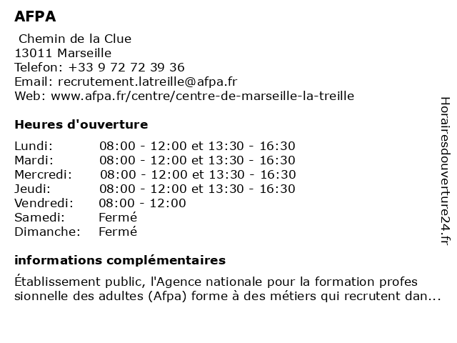 1 Afpa (Distance: 0,26 km) . Chemin de la Clue, 13011 Marseille 11 afpa, entreprise, partenaire, services 3 Afpa (Distance: 7,67 km) 54 Boulevard Laveran, 13013 Marseille 13 afpa, entreprise, partenaire, services 6 |