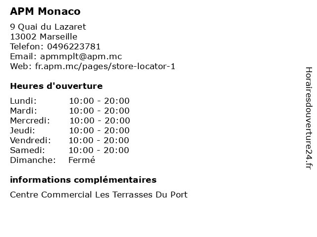 1 APM Monaco (Distance: 9,45 km) . Route de la Sablière, 13011 Marseille apm, bijouterie, bijoux, horlogerie, joaillier, monaco, montres 2 EY Sud-Est & Monaco (Distance: 0,56 km) 48 Quai du Lazaret, 13002 Marseille assurance, conseil, est, ey, fiscalité, marseille, monaco, occitanie, strategie, sud, transactions 3 Club Monaco (Galeries Lafayette) (Distance: 1,38 km) 28 Bir Hakeim, 13231 Marseille accessories, apparel, clothing, club, fashion, galeries, lafayette, monaco 4 Martine Monaco - Acupuncteur (Distance: 2,45 km) 67 Boulevard Chave, 13005 Marseille acupuncteur, clinic, martine, medecin, monaco 5 Carrosserie APM Longchamp (Distance: 3,12 km) 6 Rue Emile Duclaux, 13004 Marseille apm, atelier, automobiles, carrosserie, carrosseries, co, garage, longchamp, marseille 6 Audrey Lo Monaco - Masseur-kinésithérapeute - secrétariat (Distance: 5,64 km) 118 Avenue Jean Compadieu, 13012 Marseille audrey, docteur, kinésithérapeute, lo, masseur, monaco, médecin, médecine, secrétariat |