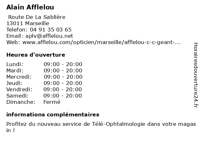 1 Alain Afflelou (Distance: 4,63 km) Centre Commercial Auchan, 13010 Marseille afflelou, alain, magasin de lunettes de soleil, magasin d’accessoires de mode, optométrie 2 Alain Afflelou (Distance: 4,90 km) - Chemin du Vallon Ver, 13006 Marseille afflelou, alain, lunettes, montures, opticien, optique 3 Alain Afflelou (Distance: 7,76 km) - Grand Littoral, 13015 Marseille afflelou, alain, glasses, optician, store 4 Alain Afflelou (Distance: 8,24 km) Centre Commercial Bourse, 13001 Marseille afflelou, alain, magasin de lunettes de soleil, magasin d’accessoires de mode, optométrie 5 Alain Afflelou (Distance: 8,79 km) Centre Commercial Carrefour Bonneveine, 13008 Marseille afflelou, alain, magasin de lunettes de soleil, magasin d’accessoires de mode, optométrie 6 Alain Afflelou (Distance: 9,22 km) 9 Quai du Lazaret, 13002 Marseille afflelou, alain, cafe, enfants.chaussures, lingerie, mode hemmes, mode homme, restaurant |