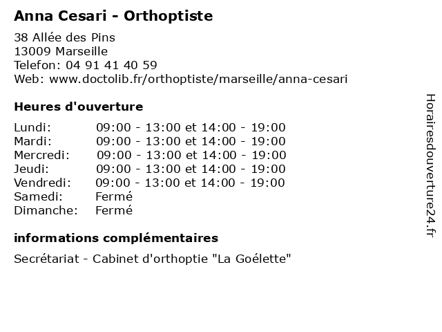 | Lundi | 09:00-13:00 et 14:00-19:00 |