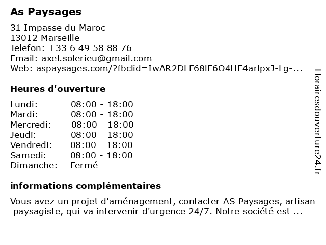 1 Carre d'As (Distance: 1,50 km) 5 Dom Des Aurengues Lot Dom Aurengues, 13013 Marseille carre, restaurants 2 AS 13 Désinfection (Distance: 5,19 km) 61 Rue Marc Dormoy, 13004 Marseille 13, as, dépigeonnage, dératisation, désinfection, désinsectisation 3 AS Autosécurité Contrôle Technique (Distance: 6,49 km) 302 Bis Boulevard National, 13003 Marseille as, auto sécurité, autosécurité, centre contrôle technique, contre visite, contrôle, contrôle pollution, contrôle technique, contrôle technique automobile, technique, véhicules léger 5 AS Autosécurité Contrôle Technique (Distance: 9,14 km) 52 Avenue de la Viste, 13015 Marseille as, auto sécurité, autosécurité, centre contrôle technique, contre visite, contrôle, contrôle pollution, contrôle technique, contrôle technique automobile, technique, véhicules léger 6 |