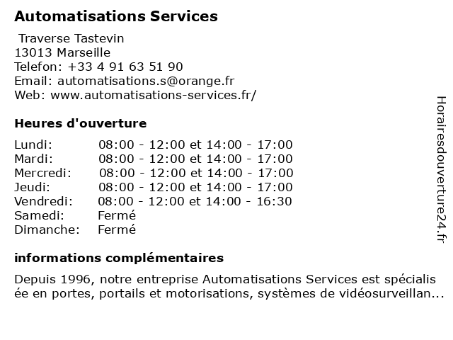 1 Automatisations Services (Distance: 8,32 km) 17 bis Zone Artisanale de la Haute Bédoule,, 13240 Septèmes-les-Vallons alarme, automatisations, automatisations services, gardiennage, services, surveillance 2 Automatisations Services (Distance: 8,43 km) 17 bis Chemin de la Haute Bédoule, 13240 Septèmes-les-Vallons automatisations, services |
