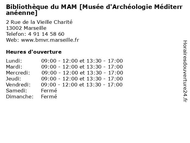 1 Bibliothèque du MAAOA [Musée d'Arts Africains, Océaniens, Amérindiens] (Distance: 0,00 km) 2 Rue de la Vieille Charité, 13002 Marseille [musée, africains, amérindiens], bibliothèque, d'arts, du, livre, maaoa, médiathèque, océaniens, services 2 Bibliothèque du Musée des Beaux Arts (Distance: 0,00 km) 2 Rue de la Vieille Charité, 13002 Marseille arts, beaux, bibliothèque, des, du, livre, musée, médiathèque, services 3 Musée d'Histoire de Marseille (Distance: 0,64 km) 17 Cours Belsunce, 13231 Marseille alimentation, beauté & santé, culture & loisirs, d'histoire, de, enfants, high-tech, maison & déco, marseille, mode, musée, restaurants 4 Bibliothèque du Musée d'Histoire de Marseille (Distance: 0,69 km) 2 Rue Henri-Barbusse, 13001 Marseille bibliothèque, d'histoire, de, du, livre, marseille, musée, médiathèque, services 5 Bibliothèque du Musée Grobet - Labadie (Distance: 0,92 km) 140 Boulevard Longchamp, 13001 Marseille bibliothèque, du, grobet, labadie, livre, musée, médiathèque, services 6 Musée Cantini - de mi-septembre à mi-mai (Distance: 1,02 km) 19 rue Grignan, 13006 Marseille cantini, de, exposition, mai, mi, musée, septembre, visite |