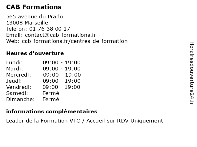 1 City-Cab (Distance: 1,29 km) 475 Rue Paradis, 13008 Marseille cab, city, service de limousine, service de transport 2 ESPACE DES POSSIBLES FORMATIONS (Distance: 3,33 km) 34 Boulevard Saccoman, 13010 Marseille cours praticien, des, espace, formateur, formations, formations et ateliers en massages et soins énérgétiques, magnétisseur, méditation, possibles, yoga 3 LC Conseils et Formations (Distance: 3,45 km) 18 r Ferdinand Rey, 13006 Marseille conseils, et, formations, lc 4 Green Cab Transport - Entreprise Taxis (Distance: 4,01 km) 83 Chemin du Vallon de Toulouse, 13010 Marseille cab, entreprise, green, taxis, transport 6 EDNH - Centre de Formation (Distance: 3,18 km) 62 rue Montgrand, 13006 Marseille centre, de, diplômes, diététique, ednh, formation, Écoles, étudiant |