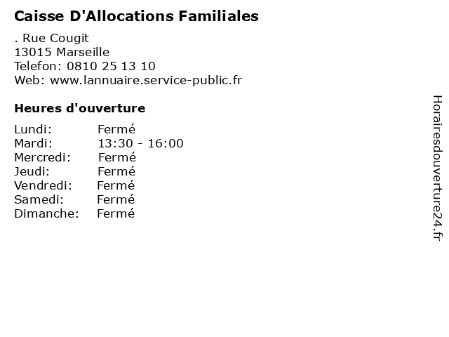 1 Caisse D'Allocations Familiales (Distance: 1,88 km) 17 Rue Malaval, 13002 Marseille administration, assoc, caisse, d'allocations, familiales, services, services publics 2 Caisse D'Allocations Familiales (Distance: 4,36 km) . De Ville, 97110 Pointe-à-Pitre administration, assoc, caisse, d'allocations, familiales, services, services publics 3 Caisse D'Allocations Familiales (Distance: 4,57 km) 71 Rue du Berceau, 13005 Marseille administration, assoc, caisse, d'allocations, familiales, services, services publics 4 Caisse D'Allocations Familiales (Distance: 4,61 km) 6 Rue Gustave-Salicis, 13012 Marseille administration, assoc, caisse, d'allocations, familiales, services, services publics 5 Caisse D'Allocations Familiales (Distance: 5,88 km) . Avenue Jean-Lombard, 13011 Marseille administration, assoc, caisse, d'allocations, familiales, services, services publics 6 Caisse D'Allocations Familiales (Distance: 8,12 km) 4 Rue Gimon, 13011 Marseille administration, assoc, caisse, d'allocations, familiales, services, services publics |