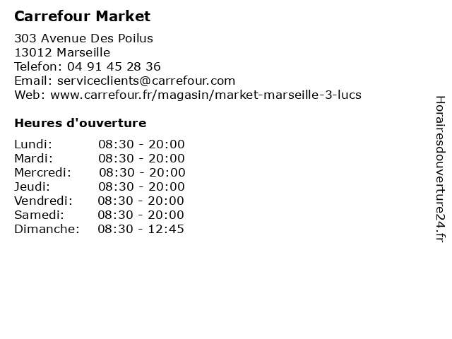 1 Carrefour Market (Distance: 1,85 km) 7 Chemin des Amaryllis, 13012 Marseille alimentaire, alimentation, carrefour, courses, distributeur, hypermarché, market, supermarché, épicerie 2 Carrefour Market (Distance: 2,65 km) 602 Avenue du 7ème Régiment de Tirailleurs Algériens, 13190 Allauch alimentation, carrefour, magasin discount, market, supermarché 3 Carrefour Market (Distance: 3,78 km) - Rue Leon Meisserel, 13012 Marseille alimentation, carrefour, magasin discount, market, supermarché 4 Carrefour Market (Distance: 4,74 km) 250 Boulevard Romain Rolland, 13009 Marseille alimentation, carrefour, magasin discount, market, supermarché 5 Carrefour Market (Distance: 5,15 km) 5 Boulevard Eugene Cabassud, 13010 Marseille alimentation, carrefour, magasin discount, market, supermarché 6 Carrefour Market (Distance: 6,18 km) 7-9-11 Rue d'Orange, 13003 Marseille alimentation, carrefour, magasin discount, market, supermarché |