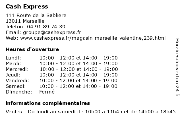 1 Cash Express (Distance: 8,11 km) 86 Rue de Rome, 13006 Marseille achat, cash, cash espress, d'achats, express, magasin, objets, salle, vendre, venez, vente, vos 2 Cash Express (Distance: 16,84 km) n/a Avenue du Plan de Campagne, 13480 Cabries achat, bijoux, cash, d'achats, express, franchise, salle, vente 3 Sud Express (Distance: 0,00 km) . Route de la Sabliere, 13011 Marseiile accessoires, chaussures, express, habillement, mode, pret-a-porter, sud, vetements 4 Carter-Cash (Distance: 0,45 km) . Montée Commandant de Robien, 13011 Marseille la Valentine batteries, carter, cash, pneus, services 5 GARAGE BEAUSEJOUR Cash (Distance: 3,57 km) Route de la Légion, 13400 Aubagne beausejour, cash, concessionnaire aubagne, concessionnaire automobile, garage, garage aubagne 6 Esso Express La Demande (Distance: 6,44 km) 550 Avenue Antoine Boyer, 13400 Aubagne carburant, demande, esso, express, la, services, station, véhicules |