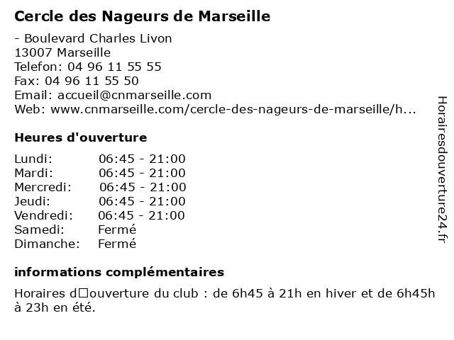1 Annexe Cercle De Garnison Ganteaume (Distance: 0,01 km) 2 Boulevard Charles Livon, 13007 Marseille annexe, aubagne, base, cercle, defense, ganteaume, garnison, marseille, mess, restaurants 2 Cercle des Nageurs de Marseille - Bureaux du Secrétariat (Distance: 0,68 km) - Extrémité Boulevard Charles Livon, 13007 Marseille bureaux, cercle, club, de, des, du, marseille, nageurs, natation, piscine, secrétariat, sport, sportif, water-polo 3 Cercle des Nageurs de Marseille - Club - Hiver (Distance: 0,68 km) - Extrémité Boulevard Charles Livon, 13007 Marseille cercle, club, de, des, hiver, marseille, nageurs, natation, sport, sportif, sports, water-polo 4 Cercle des Nageurs de Marseille - Club - Été (Distance: 0,68 km) - Extrémité Boulevard Charles Livon, 13007 Marseille cercle, club, de, des, marseille, nageurs, natation, piscine, sport, sportif, water-polo, été 5 Cercle des Nageurs de Marseille - Bassins (Distance: 0,68 km) - Extrémité Boulevard Charles Livon, 13007 Marseille bassins, cercle, club, de, des, marseille, nageurs, natation, piscine, sport, sportif, water-polo 6 Cercle des Coiffeurs (Distance: 1,50 km) 165 Rue paradis, 13006 Marseille cercle, cercle des coiffeurs, coiffeurs, coiffure, des, marseille |