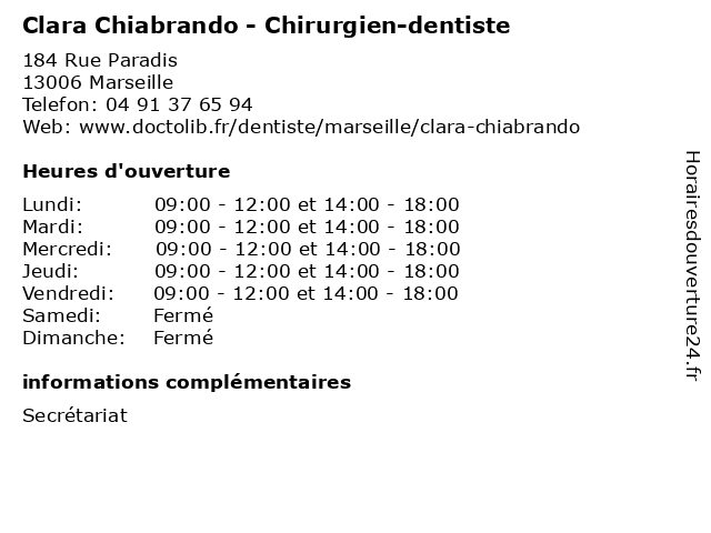 1 Clara Chiabrando - Chirurgien-dentiste (Distance: 13,85 km) 900 Chemin de la Gélatine, 13400 Aubagne chiabrando, chirurgien, clara, dent, dentiste, docteur, soins 2 Clara André - Sage-femme (Distance: 0,17 km) 77 rue du Docteur Escat, 13006 Marseille andre, andré, clara, consultation, docteur, dr, femme, med, médecin, sage, traitement 3 Maître Clara Lemarchand - Avocate (Distance: 0,47 km) 103 Boulevard Notre Dame, 13006 Marseille avocate, avocats, civils, clara, droits, juridiques, lemarchand, maître 4 Maître Anna-Clara Bianchi - Avocate (Distance: 0,92 km) 38 rue Grignan, 13001 Marseille anna, avocate, avocats, bianchi, civils, clara, droits, juridiques, maître 5 Dr Clara Pavia - Chirurgien-dentiste (Distance: 1,01 km) 39 Cours Lieutaud, 13001 Marseille chirurgien, clara, dentaire, dentiste, dr, implantologie, parodontologie, pavia 6 Societe Civile Immobiliere Clara (Distance: 1,17 km) 74 Rue Des 3 Freres Barthelemy, 13006 Marseille bailleurs, biens, civile, clara, immobiliere, immobiliers, nra, societe |
