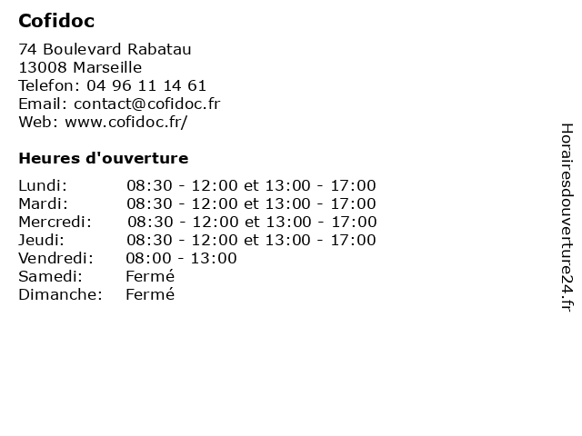 | Lundi | 08:30-12:00 et 13:00-17:00 |