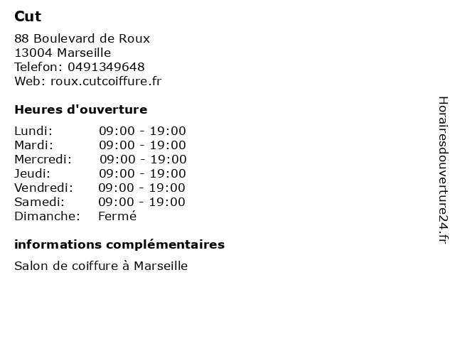 1 Cut (Distance: 0,70 km) 190 avenue des chartreux, 13004 Marseille beauté, coiffure, coiffures, coloristes, cut 2 Cut (Distance: 1,13 km) 46 Boulevard Pardigon, 13004 Marseille beauté, coiffure, coiffures, coloristes, cut 3 Cut (Distance: 1,21 km) 78 Avenue des Chutes Lavie, 13004 Marseille beauté, coiffure, coiffures, coloristes, cut 6 So Cut(e) (Distance: 3,17 km) 26 Avenue Emmanuel Allard, 13011 Marseille beauté, coiffure, coiffures, coloristes, cut, so |