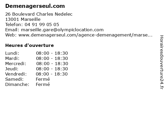 1 DemenagerSeul.com (Distance: 1,83 km) 30 Rue des Orgues, 13004 Marseille agences, cartons, demenagerseul, demenagerseul.com, déménagement, services 2 DemenagerSeul.com (Distance: 3,19 km) 60 Boulevard du Capitaine Géze, 13014 Marseille agences, cartons, demenagerseul, demenagerseul.com, déménagement, services 3 Demenagerseul.com (Distance: 10,80 km) - Rond point de Saint-Menet, 13011 Marseille box, cartons, demenagerseul.com, meuble, services 4 DemenagerSeul.com (Distance: 17,10 km) - Route departementale D6, 13220 Gardanne agences, cartons, demenagerseul, demenagerseul.com, déménagement, services 5 DemenagerSeul.com (Distance: 17,64 km) - Rue René Cailloux, 13700 Marignane agences, cartons, demenagerseul, demenagerseul.com, déménagement, services 6 Demenagerseul.com (Distance: 18,19 km) 474 avenue de la fleuride, 13400 Aubagne agence, cartons, demenagerseul.com, déménagements, location, utilitaires, véhicules |