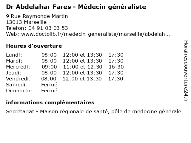 1 Dr Fares Benmiloud - Chirurgien endocrinien (Distance: 3,65 km) 6 rue Désirée Clary, 13003 Marseille benmiloud, chirurgien, consultation, docteur, dr, endocrinien, fares, med, médecin, médecine, traitement 3 Dr Ali Al Fares - Cardiologue (Distance: 23,21 km) - Avenue des Tamaris, 13616 Aix-en-Provence al, ali, cardiologue, consultation, docteur, dr, fares, med, médecin, médecine, traitement 4 Dr Ali Al Fares - Cardiologue (Distance: 42,56 km) 207 avenue Julien Fabre, 13658 Salon-de-Provence al, ali, cardiologue, consultation, docteur, dr, fares, med, médecin, médecine, traitement 5 Lionel Nabet - Pédicure-podologue (Distance: 0,06 km) 13 Rue Raymonde Martin, 13013 Marseille dr, lionel, medical, nabet, podologue, pédicure, secrétariat 6 Dr Anais Jourdan - Médecin généraliste (Distance: 0,10 km) 15 Rue Raymonde Martin, 13013 Marseille anais, de, docteur, dr, generaliste, généraliste, jourdan, malpassé, mds, medical, médecin, pmi, soin, vallon |