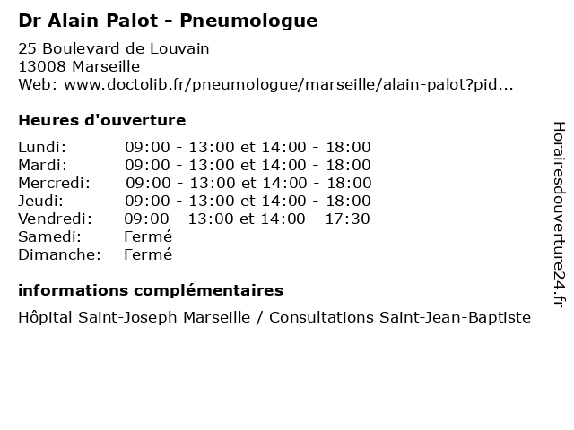 1 Dr Laurent Meslin - Pneumologue (Distance: 0,04 km) 26 Boulevard de Louvain, 13008 Marseille allergie, allergologue, dr, laurent, meslin, pneumologue, soins 2 Dr Arnaud Boyer - Pneumologue (Distance: 0,05 km) 26 Boulevard de Louvain, 13008 Marseille 13008, arnaud, boyer, bâtiment, dr, marseille, monique, pneumologue, sainte 3 Pierre Alain Cazenave - Masseur-kinésithérapeute (Distance: 0,06 km) 27 Boulevard de Louvain, 13008 Marseille alain, cazenave, docteur, kinésithérapeute, masseur, médecin, médecine, pierre, secrétariat 4 Dr Alain Mouly - Chirurgien ophtalmologue (Distance: 0,65 km) 433 bis rue Paradis, 13008 Marseille alain, chirurgien, dr, mouly, ophtalmologie, ophtalmologistes, ophtalmologue, vision 5 Alain Figaret (Distance: 0,76 km) 41 Boulevard Michelet, 13008 Marseille alain, chemises, cravates, femme, figaret, marseille, mode homme, pantalons 6 Dr Alain Pascal - Gynécologue médical et obstétrique (Distance: 0,79 km) 345 Avenue du Prado, 13008 Marseille alain, bebe, dr, et, gynecologie, gynécologue, maternite, médical, obstetrique, obstétrique, pascal |