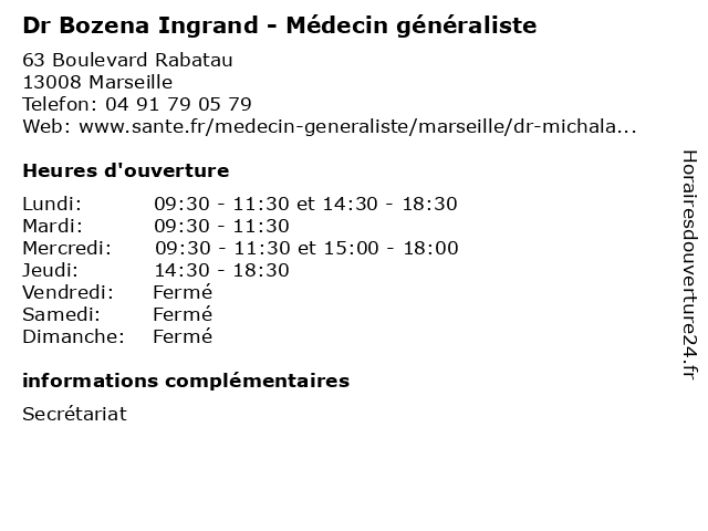 | Mercredi | 09:30-11:30 et 15:00-18:00 |