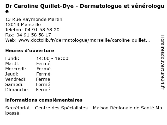 1 Dr Caroline Curvale - Chirurgien de la main (Distance: 0,00 km) 13 Rue Raymonde Martin, 13013 Marseille caroline, chirurgien, curvale, de, dr, la, main 2 Dr Lyazid Mezi - Dermatologue et vénérologue (Distance: 0,00 km) 13 Rue Raymonde Martin, 13013 Marseille boutons, dermatologue, docteur, dr, et, liason, lyazid, mezi, venerologue, vénérologue 3 Dr Caroline Curvale - Chirurgien de la main (Distance: 1,66 km) 22 Rue des Linots, 13012 Marseille caroline, chirurgien, curvale, de, dr, la, main 4 Caroline Bernard - Ostéopathe (Distance: 1,66 km) 24 Rue des Linots, 13012 Marseille bernard, caroline, consultation, docteur, med, médecin, médecine, ostéopathe, traitement 5 Caroline Bernard - Ostéopathe - secrétariat (Distance: 3,30 km) 96 Avenue des Caillols,, 13012 Marseille bernard, caroline, médecin, médecine, médical, ostéopathe, pharmaceutique, secrétariat, traitement 6 Dr Caroline Viallet Cheilan - Cardiologue (Distance: 3,69 km) 6 rue Désirée Clary, 13003 Marseille cardiologue, caroline, cheilan, consultation, docteur, dr, med, médecin, médecine, traitement, viallet |