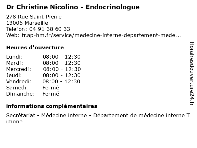 1 Dr Patrick Disdier - Endocrinologue (Distance: 0,00 km) 278 Rue Saint-Pierre, 13005 Marseille consultation, disdier, docteur, dr, endocrinologue, med, médecin, médecine, patrick, traitement 2 Dr Christine Bouffier-Escrig - Anesthésiste (Distance: 0,09 km) 264 Rue Saint-Pierre, 13005 Marseille anesthésiste, bouffier, christine, consultation, docteur, dr, escrig, med, medecine, medical, médecin, traitement 3 Dr Marie-Christine Habib - Anatomo-cyto-pathologiste (Distance: 0,09 km) 264 Rue Saint-Pierre, 13005 Marseille anatomo, christine, consultation, cyto, docteur, dr, habib, marie, med, medecine, medical, médecin, pathologiste, traitement 4 Dr Christine Zandotti - Médecin biologiste (Distance: 0,09 km) 264 Rue Saint-Pierre, 13005 Marseille biologiste, christine, consultation, docteur, dr, med, medecine, medical, médecin, traitement, zandotti 5 Dr Marie-Christine Pellissier - Généticien (Distance: 0,09 km) 264 Rue Saint-Pierre, 13005 Marseille christine, consultation, docteur, dr, généticien, marie, med, médecin, pellissier, traitement 6 Dr Christine Gennari - Pédiatre (Distance: 0,09 km) 264 Rue Saint-Pierre, 13005 Marseille christine, consultation, docteur, dr, gennari, med, médecin, pédiatre, traitement |
