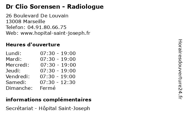1 Dr Clio Loeve - Gastro-entérologue et hépatologue (Distance: 4,11 km) 6 rue Désirée Clary, 13003 Marseille clio, consultation, docteur, dr, entérologue, et, gastro, hépatologue, loeve, med, médecin, médecine, traitement 2 Clio Jean Marc Albert (Distance: 13,72 km) Cecilia , 13170 Les Pennes Mirabeau albert, clio, jean, marc, restaurants 3 Dr Olivier Bayle - Radiologue (Distance: 0,00 km) 26 Boulevard De Louvain, 13008 Marseille bayle, consultation, docteur, dr, med, médecin, médecine, olivier, radiologue, traitement 4 Dr Patrick Beaurain - Radiologue (Distance: 0,00 km) 26 Boulevard De Louvain, 13008 Marseille beaurain, consultation, docteur, dr, med, médecin, médecine, patrick, radiologue, traitement 5 Dr Pierre Cassagneau - Radiologue (Distance: 0,00 km) 26 Boulevard De Louvain, 13008 Marseille cassagneau, consultation, docteur, dr, med, médecin, médecine, pierre, radiologue, traitement 6 Dr Anne-Claire Chabrol Prado - Radiologue (Distance: 0,00 km) 26 Boulevard De Louvain, 13008 Marseille anne, chabrol, claire, consultation, docteur, dr, med, médecin, médecine, prado, radiologue, traitement |