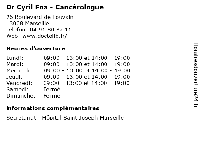 1 Dr Cyril Foa - Cancérologue (Distance: 4,29 km) 317 Boulevard du Redon, 13009 Marseille cancérologue, consultation, cyril, docteur, dr, foa, med, médecin, médecine, traitement 2 Dr Jean-Baptiste Paoli - Cancérologue (Distance: 0,00 km) 26 Boulevard de Louvain, 13008 Marseille 13008, baptiste, bâtiment, cancérologue, dr, jean, marseille, monique, paoli, sainte 3 Dr Cyril Saint-Marc - Psychiatre (Distance: 0,32 km) 185 Avenue du Prado, 13008 Marseille cyril, dr, folie, marc, psychiatre, psychiatrie, psychiatrique, saint 4 Dr Cyril Nafati - Anesthésiste (Distance: 1,64 km) 147 boulevard Baille, 13005 Marseille anesthésiste, consultation, cyril, docteur, dr, med, medecine, medical, médecin, nafati, traitement 5 Maître Cyril Villatte de Peufeilhoux - Avocat (Distance: 2,03 km) 1 rue Montgrand, 13006 Marseille avocat, avocate, avocats, civils, cyril, de, droits, juridiques, maître, peufeilhoux, villatte 6 Cyril Tordjman - Masseur-kinésithérapeute (Distance: 2,11 km) 20 Boulevard de Pont de Vivaux, 13010 Marseille bien-être, cyril, en, forme, kinésithérapeute, kinésithérapie, masseur, remise, rééducation, tordjman |