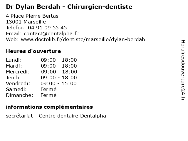 1 Dr Dylan Berdah - Chirurgien-dentiste (Distance: 0,00 km) 4 Place Pierre Bertas, 13001 Marseille berdah, chirurgien, dentaire, dentiste, dr, dylan, implantologie, parodontologie 2 Dr Kelly Setbon Berdah - Chirurgien-dentiste (Distance: 0,00 km) 4 Place Pierre Bertas, 13001 Marseille berdah, chirurgien, dentaire, dentiste, dr, implantologie, kelly, parodontologie, setbon 3 Dr Kelly Setbon Berdah - Chirurgien-dentiste (Distance: 0,00 km) 4 Place Pierre Bertas, 13001 Marseille berdah, chirurgien, chirurgien-dentiste, dentiste, dr, kelly, médecins, médicaments, santé, secrétariat, setbon, spécialiste 4 Maître Isabelle Berdah - Avocate (Distance: 0,81 km) 29 rue Paradis, 13001 Marseille avocate, avocats, berdah, civils, droits, isabelle, juridiques, maître 5 Dr Nicole Berdah - Gynécologue (Distance: 1,31 km) 10 Rue Edmond Rostand, 13006 Marseille berdah, care, clinic, dr, gynécologue, health, nicole 6 Dylan Audebet - Masseur-kinésithérapeute (Distance: 4,91 km) 25 Boulevard Central, 13014 Marseille audebet, dylan, kiné, kinésithérapeute, masseur, rééducation, soin |