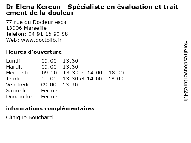 | Mercredi | 09:00-13:30 et 14:00-18:00 |