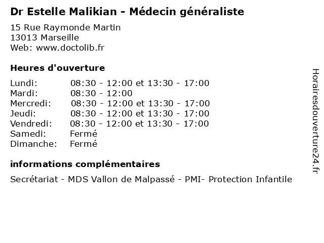 | Lundi | 08:30-12:00 et 13:30-17:00 |