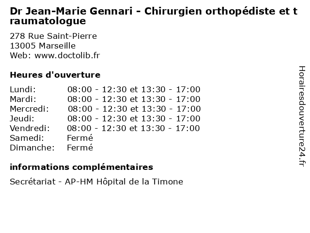 1 Dr Jean-Marie Gennari - Chirurgien orthopédiste et traumatologue (Distance: 18,41 km) - rue Bel Air, 13127 Vitrolles chirurgien, consultation, docteur, dr, et, gennari, jean, marie, med, médecin, médecine, orthopédiste, traitement, traumatologue 2 Pr Elke Viehweger - Chirurgien orthopédiste et traumatologue (Distance: 0,00 km) 278 Rue Saint-Pierre, 13005 Marseille chirurgien, consultation, docteur, elke, et, med, médecin, médecine, orthopédiste, pr, traitement, traumatologue, viehweger 3 Dr Sebastien Pesenti - Chirurgien orthopédiste et traumatologue (Distance: 0,00 km) 278 Rue Saint-Pierre, 13005 Marseille chirurgien, consultation, docteur, dr, et, med, médecin, médecine, orthopédiste, pesenti, sebastien, traitement, traumatologue 4 Dr Emilie Peltier - Chirurgien orthopédiste et traumatologue (Distance: 0,00 km) 278 Rue Saint-Pierre, 13005 Marseille chirurgien, consultation, docteur, dr, emilie, et, med, médecin, médecine, orthopédiste, peltier, traitement, traumatologue 5 Dr Naïma Loucheur - Chirurgien orthopédiste et traumatologue (Distance: 0,00 km) 278 Rue Saint-Pierre, 13005 Marseille chirurgien, consultation, docteur, dr, et, loucheur, med, médecin, médecine, naïma, orthopédiste, traitement, traumatologue 6 Dr Estelle Litzelmann - Chirurgien orthopédiste et traumatologue (Distance: 0,00 km) 278 Rue Saint-Pierre, 13005 Marseille chirurgien, consultation, docteur, dr, estelle, et, litzelmann, med, médecin, médecine, orthopédiste, traitement, traumatologue |