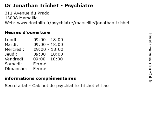 1 Dr Valentin Lao - Psychiatre (Distance: 0,02 km) 311 Avenue du Prado, 13008 Marseille dr, folie, lao, psychiatre, psychiatrie, psychiatrique, valentin 2 Dr Michaël Saada - Psychiatre (Distance: 0,11 km) 314 Avenue du Prado, 13008 Marseille consultation, docteur, dr, med, michaël, médecin, médecine, psychiatre, saada, secrétariat, traitement 3 Dr David Soffer - Psychiatre (Distance: 0,11 km) 314 Avenue du Prado, 13008 Marseille consultation, david, docteur, dr, med, médecin, médecine, psychiatre, secrétariat, soffer, traitement 4 Dr William Samama - Psychiatre (Distance: 0,32 km) 501 Rue Paradis, 13008 Marseille dr, folie, psychiatre, psychiatrie, psychiatrique, samama, william 5 Dr Renaud Clarte - Psychiatre (Distance: 0,57 km) 26 Boulevard de Louvain, 13008 Marseille clarte, dr, médecins, médicaments, psychiatre, renaud, santé, secrétariat, spécialiste 6 Dr Catherine Colonne - Psychiatre (Distance: 0,57 km) 26 Boulevard de Louvain, 13008 Marseille catherine, colonne, dr, médecins, médicaments, psychiatre, santé, secrétariat, spécialiste |