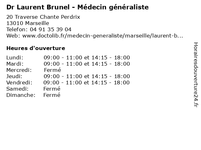 1 Dr Laurent Brunel - Médecin généraliste (Distance: 0,01 km) 20 Traverse de Chante Perdrix, 13010 Marseille brunel, consultation, docteur, dr, généraliste, laurent, med, médecin, traitement 2 Medecin Laurent Combette (Cardiologue) (Distance: 2,11 km) 97 Avenue William Booth, 13012 Marseille cardiologue, combette, docteur, laurent, medecin, sante, services 3 Dr Marie-France Brunel-Mercier - Anesthésiste (Distance: 3,14 km) 147 boulevard Baille, 13005 Marseille anesthésiste, brunel, consultation, docteur, dr, france, marie, med, medecine, medical, mercier, médecin, traitement 4 Dr. Michel Laurent - Dentiste (Distance: 3,81 km) 307 Rue Paradis, 13008 Marseille dentiste, docteur, dr., laurent, medecins, michel, sante 5 Maître Elodie Brunel - Avocate (Distance: 4,55 km) 74 rue Saint Jacques, 13006 Marseille avocate, avocats, brunel, civils, droits, elodie, juridiques, maître 6 Maître Elodie Brunel - Avocat (Distance: 4,85 km) 16 Boulevard Notre Dame, 13006 Marseille avocat, brunel, elodie, justice, lois, maitre, maître |