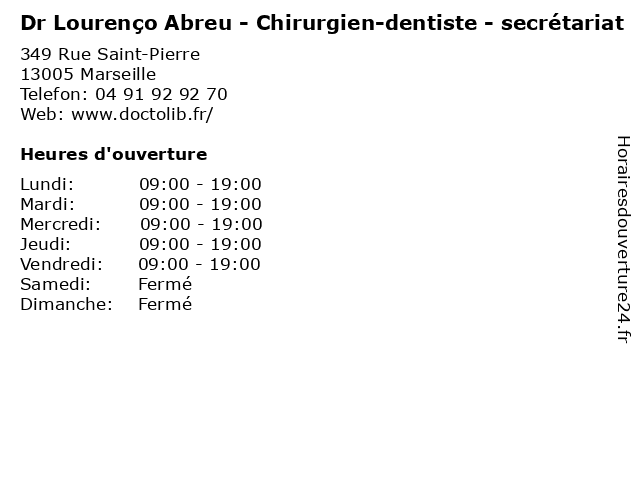 1 Dr Lourenço Abreu - Chirurgien-dentiste (Distance: 1,50 km) 49 Rue Saint-Pierre, 13005 Marseille abreu, chirurgien, dentiste, dr, lourenço, médecin, médecine, médical, pharmaceutique, traitement 2 Dr Fernand Roux - Chirurgien-dentiste (Distance: 0,00 km) 349 Rue Saint-Pierre, 13005 Marseille chirurgien, dentiste, dr, fernand, médecin, médecine, médical, pharmaceutique, roux, traitement 3 Dr Noémie Boudin - Chirurgien-dentiste - secrétariat (Distance: 0,00 km) 349 Rue Saint-Pierre, 13005 Marseille boudin, chirurgien, consultation, dentiste, docteur, dr, med, noémie, secrétariat 4 Dr Yoni Djedou - Chirurgien-dentiste - secrétariat (Distance: 0,00 km) 349 Rue Saint-Pierre, 13005 Marseille chirurgien, consultation, dentiste, djedou, docteur, dr, med, secrétariat, yoni 5 Dr Arie Abihssira - Chirurgien-dentiste (Distance: 1,25 km) 179 Avenue de la Capelette, 13010 Marseille abihssira, arie, chirurgien, dentiste, dr, médecin, médecine, médical, pharmaceutique, traitement 6 Dr Charlotte Vial - Chirurgien-dentiste (Distance: 1,25 km) 179 Avenue de la Capelette, 13010 Marseille charlotte, chirurgien, dentiste, dr, médecin, médecine, médical, pharmaceutique, traitement, vial |
