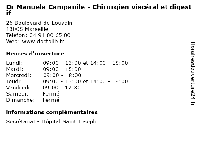 1 Dr Sami Hamed - Chirurgien viscéral et digestif (Distance: 0,00 km) 26 Boulevard de Louvain, 13008 Marseille chirurgien, consultation, digestif, docteur, dr, et, hamed, med, médecin, médecine, sami, secrétariat, traitement, viscéral 2 Dr Claude Jacquin - Chirurgien viscéral et digestif - secrétariat (Distance: 0,26 km) 255 Avenue du Prado, 13008 Marseille chirurgien, claude, consultation, digestif, docteur, dr, et, jacquin, med, médecin, médecine, secrétariat, traitement, viscéral 3 Medecin Thomas Crespy (Chirurgien viscéral) (Distance: 0,80 km) 8 Farges, 13008 Marseille chirurgien, crespy, docteur, medecin, sante, services, thomas, viscéral 4 Dr Stéphane Cherki - Chirurgien viscéral et digestif - secrétariat (Distance: 1,15 km) 33 Avenue de Toulon, 13006 Marseille cherki, chirurgien, consultation, digestif, docteur, dr, et, med, médecin, médecine, secrétariat, stéphane, traitement, viscéral 5 Dr Pierre Leyre - Chirurgien viscéral et digestif - secrétariat (Distance: 1,94 km) 16 Rue Gaston Berger, 13010 Marseille chirurgien, consultation, digestif, docteur, dr, et, leyre, med, médecin, médecine, pierre, secrétariat, traitement, viscéral 6 Dr Nicolas Plaisant - Chirurgien viscéral et digestif - secrétariat (Distance: 1,94 km) 16 Rue Gaston Berger, 13010 Marseille chirurgien, consultation, digestif, docteur, dr, et, med, médecin, médecine, nicolas, plaisant, secrétariat, traitement, viscéral |