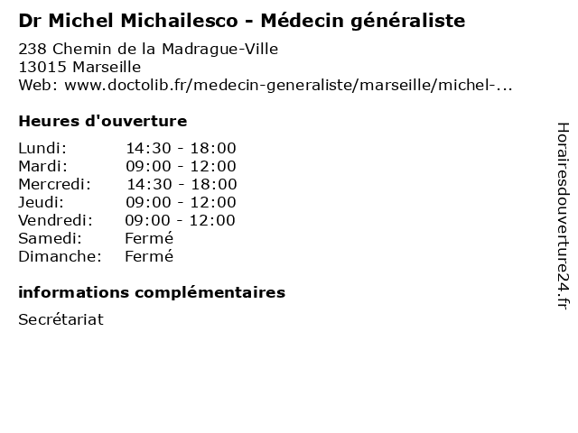 1 Dr Carole Michailesco - Médecin généraliste (Distance: 0,01 km) 238 Chemin de la Madrague Ville, 13015 Marseille carole, consultation, docteur, dr, généraliste, med, michailesco, médecin, traitement 2 Dr Michel Raquet - Dentiste (Distance: 4,68 km) 37 Rue Grignan, 13006 Marseille care, clinic, dentist, dentiste, dr, france, health, michel, raquet, service 3 Dr Michel Conte - Gynécologue (Distance: 5,64 km) 33 Avenue de Toulon, 13006 Marseille care, clinic, conte, dr, gynécologue, health, michel 4 Dr. Laurent Michel - Dentiste (Distance: 5,86 km) 32 Avenue Croix Rouge, 13013 Marseille dentiste, docteur, dr., laurent, medecins, michel, sante 5 Dr. Guy Michel Lambruschini - Dentiste (Distance: 5,89 km) 65 Avenue Du Prado, 13006 Marseille dentiste, docteur, dr., guy, lambruschini, medecins, michel, sante 6 Dr. Michel Laurent - Dentiste (Distance: 6,13 km) 307 Rue Paradis, 13008 Marseille dentiste, docteur, dr., laurent, medecins, michel, sante |