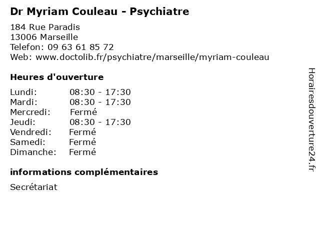 1 Dr Ozlem Can - Psychiatre (Distance: 0,17 km) 77 Rue Dr Escat, 13006 Marseille can, dr, folie, ozlem, psychiatre, psychiatrie, psychiatrique 2 Dr Anis Dhaouadi - Psychiatre (Distance: 0,17 km) 58 Rue Edmond Rostand, 13006 Marseille anis, dhaouadi, dr, folie, psychiatre, psychiatrie, psychiatrique 3 Dr Jean-Pierre Joubert - Psychiatre (Distance: 0,26 km) 22 Place Castellane, 13006 Marseille consultation, docteur, dr, jean, joubert, med, médecin, pierre, psychiatre, traitement 4 Dr Pierre Polomeni - Psychiatre (Distance: 0,26 km) 22 Place Castellane, 13006 Marseille consultation, docteur, dr, med, médecin, pierre, polomeni, psychiatre, traitement 5 Dr Myriam Roumy - Chirurgien-dentiste (Distance: 0,26 km) 22 Place Castellane, 13006 Marseille chirurgien, consultation, dentiste, docteur, dr, med, myriam, médecin, roumy, traitement 6 Dr Violaine Gubler - Psychiatre de l'enfant et de l'adolescent (Distance: 0,35 km) 255 Avenue du Prado, 13008 Marseille consultation, de, docteur, dr, et, gubler, l'adolescent, l'enfant, med, médecin, médecine, psychiatre, secrétariat, traitement, violaine |