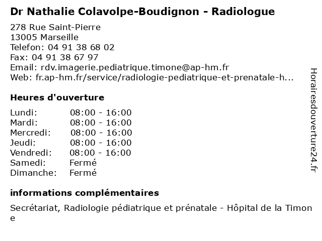 1 Dr Cécile Colavolpe - Médecin nucléaire (Distance: 0,09 km) 264 Rue Saint-Pierre, 13005 Marseille cecile, colavolpe, consultation, cécile, docteur, dr, med, medecine, medical, médecin, nucléaire, traitement 2 Dr Nathalie Michel - Psychiatre (Distance: 0,49 km) 147 boulevard Baille, 13005 Marseille consultation, docteur, dr, med, medecine, medical, michel, médecin, nathalie, psychiatre, traitement 3 Nathalie Elbaz (Distance: 1,56 km) 61 rue d'Italie, 13006 Marseille cortège, cérémonie, elbaz, mariage, nathalie, robe, tenue 4 Dr Nathalie Quiles - Dermatologue - secrétariat (Distance: 1,84 km) - Traverse de l'Antignane, 13008 Marseille consultation, dermatologue, docteur, dr, med, médecin, médecine, nathalie, quiles, secrétariat, traitement 5 Maître Nathalie Lauricella - Avocate (Distance: 2,04 km) 44 rue Montgrand, 13006 Marseille avocate, avocats, civils, droits, juridiques, lauricella, maître, nathalie 6 Maître Nathalie Fenech - Avocate (Distance: 2,23 km) 72 rue Grignan, 13001 Marseille avocate, avocats, civils, droits, fenech, juridiques, maître, nathalie |