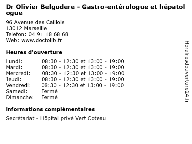 1 Dr Olivier Belgodere - Gastro-entérologue et hépatologue (Distance: 4,34 km) 51 Rue de Rome, 13001 Marseille belgodere, consultation, docteur, dr, entérologue, et, gastro, hépatologue, med, médecin, médecine, olivier, secrétariat, traitement 2 Dr Olivier Belgodere - Gastro-entérologue et hépatologue (Distance: 4,47 km) 22 Rue Montgrand, 13006 Marseille belgodere, consultation, docteur, dr, entérologue, et, gastro, hépatologue, med, médecin, olivier, traitement 3 Dr Olivier Belgodere - Gastro-entérologue et hépatologue (Distance: 4,93 km) 38 Rue Jean Trinquet, 13002 Marseille belgodere, dr, entérologue, et, gastro, hépatologue, médecin, médecine, médical, olivier, pharmaceutique, traitement 4 Dr Charlie Affriat - Gastro-entérologue et hépatologue (Distance: 0,00 km) 96 Avenue des Caillols, 13012 Marseille affriat, charlie, consultation, docteur, dr, entérologue, et, gastro, hépatologue, med, médecin, médecine, secrétariat, traitement 5 Lycée Privé L'Olivier - Robert Coffy (Distance: 0,65 km) 29 avenue des Caillols, 13012 Marseille cio, coffy, college, cours, ecole, education, elementaire, enseignement, l'olivier, lycee, lycée, maternelle, nationale, orientation, primaire, prive, privee, privé, public, robert 6 Olivier Penchi - Masseur-kinésithérapeute (Distance: 1,63 km) 150 Avenue Jean Lombard,, 13011 Marseille kiné, kinésithérapeute, masseur, olivier, penchi, rééducation, soin |