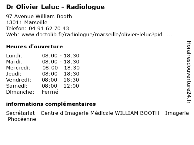 1 Dr Olivier Leluc - Radiologue (Distance: 4,96 km) 116 Rue Jean Mermoz, 13008 Marseille dr, leluc, médecin, médecine, médical, olivier, pharmaceutique, radiologue, secretariat, secrétariat, traitement 2 Dr Olivier Leluc - Radiologue (Distance: 5,24 km) 116 Rue Jean Mermoz, 13008 Marseille consultation, docteur, dr, leluc, med, médecin, médecine, olivier, radiologue, secrétariat, traitement 3 Dr Olivier Leluc - Radiologue - secretariat (Distance: 0,17 km) 97 Avenue William Booth, 13012 Marseille dr, leluc, médecin, médecine, médical, olivier, pharmaceutique, radiologue, secretariat, traitement 4 Olivier Penchi - Masseur-kinésithérapeute (Distance: 0,91 km) 150 Avenue Jean Lombard,, 13011 Marseille kiné, kinésithérapeute, masseur, olivier, penchi, rééducation, soin 6 Olivier Penchi - Masseur-kinésithérapeute (Distance: 1,31 km) 220 Boulevard de Saint-Loup, 13010 Marseille kiné, kinésithérapeute, masseur, olivier, penchi, rééducation, soin |