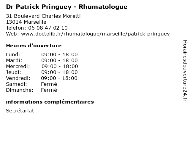 1 Dr.Patrick Philibert- VIH (Distance: 1,76 km) 1 rue Melchior Guinot, 13003 Marseille consultation, docteur, dr.patrick, philibert, santé, vih 2 Medecin Patrick El Harrar (Acupuncteur) (Distance: 3,03 km) 102 La Canebiere, 13001 Marseille acupuncteur, docteur, el, harrar, medecin, patrick, sante, services 3 Dr.Patrick Vittot-Cardiologie (Distance: 3,46 km) 120 Boulevard Chave, 13005 Marseille cardiologie, consultation, docteur, dr.patrick, santé, vittot 4 Medecin Patrick Moro (Cardiologue) (Distance: 3,66 km) 12 Rue des Electriciens, 13012 Marseille cardiologue, docteur, medecin, moro, patrick, sante, services 5 Dr Palacci Patrick - Dentiste (Distance: 4,94 km) 8 Rue farges, 13008 Marseille dentiste, docteur, dr, marseille, palacci, patrick 6 Dr. Patrick Esquer - Ophtalmologie (Distance: 5,79 km) 72 avenue des Poilus, 13013 Marseille consultation, docteur, dr., esquer, ophtalmologie, patrick, santé |