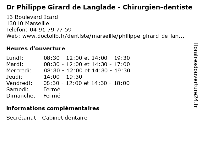 1 Dr Philippe Bensoussan - Radiologue - secrétariat (Distance: 0,27 km) 114 Boulevard Romain Rolland, 13010 Marseille bensoussan, consultation, docteur, dr, med, médecin, médecine, philippe, radiologue, secrétariat, traitement 2 Dr Jean-Philippe Pain - Chirurgien-dentiste - secrétariat (Distance: 0,63 km) 159 Boulevard de Pont de Vivaux, 13010 Marseille chirurgien, consultation, dentiste, docteur, dr, jean, med, pain, philippe, secrétariat 3 Dr. Philippe Didier - Dentiste (Distance: 1,57 km) 38 Boulevard de Sainte Marguerite, 13009 Marseille dentiste, didier, docteur, dr., medecins, philippe, sante 4 Marion Girard - Masseur-kinésithérapeute - secrétariat (Distance: 2,00 km) 27 Boulevard de Louvain, 13008 Marseille docteur, girard, kinésithérapeute, marion, masseur, médecin, médecine, secrétariat 5 Dr Patrice Girard De Langlade - Ophtalmologue (Distance: 2,03 km) 26 Boulevard de Louvain, 13008 Marseille de, dr, girard, langlade, médecins, médicaments, ophtalmologue, patrice, santé, secrétariat, spécialiste 6 Dr Philippe Laurent - Pneumologue (Distance: 2,38 km) 149 avenue du Prado, 13008 Marseille allergologie, consultation, docteur, dr, laurent, philippe, pneumologie, pneumologue, santé |