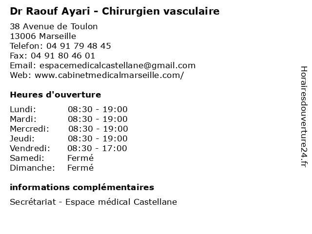 1 Dr Raouf Ayari - Chirurgien vasculaire (Distance: 5,12 km) 13 Rue Raymonde Martin, 13013 Marseille ayari, chirurgien, consultation, docteur, dr, med, médecin, médecine, raouf, traitement, vasculaire 2 Dr Raouf Ayari - Chirurgien vasculaire (Distance: 11,73 km) 33 Boulevard des Farigoules, 13400 Aubagne ayari, chirurgien, consultation, docteur, dr, med, médecin, médecine, raouf, secrétariat, traitement, vasculaire 3 Dr Anis Ayari - Cardiologue (Distance: 1,16 km) 26 Boulevard de Louvain, 13008 Marseille anis, ayari, cardiologue, dr, médecins, médicaments, santé, secrétariat, spécialiste 4 Medecin Jean Jacques Albrand (Chirurgien vasculaire) (Distance: 1,16 km) 26 Boulevard de Louvain, 13008 Marseille albrand, chirurgien, docteur, jacques, jean, medecin, sante, services, vasculaire 5 Dr Michel Ferdani - Chirurgien vasculaire (Distance: 1,89 km) 393 Avenue du Prado, 13008 Marseille chirurgien, consultation, docteur, dr, ferdani, med, michel, médecin, médecine, traitement, vasculaire 6 Dr Simon Brachet - Chirurgien vasculaire (Distance: 1,89 km) 393 Avenue du Prado, 13008 Marseille brachet, chirurgien, consultation, docteur, dr, med, médecin, simon, traitement, vasculaire |