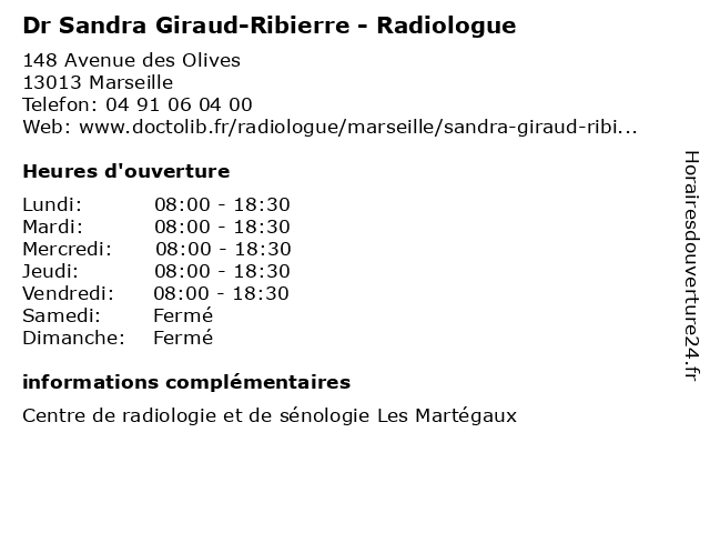 1 Dr Dany Giraud - Radiologue - secretariat (Distance: 0,00 km) 148 Avenue des Olives, 13013 Marseille dany, dr, giraud, médecin, médecine, médical, pharmaceutique, radiologue, secretariat, traitement 2 Denis Giraud - Chirurgien-dentiste (Distance: 0,05 km) 158 Avenue des Olives, 13013 Marseille chirurgien, denis, dent, dentiste, docteur, giraud, soins 3 Assistance Auto Giraud Remorquage (Distance: 0,73 km) 43 Traverse des Partisans, 13013 Marseille assistance, auto, depannage, dépannage, emorquage, giraud, moto, remorquage, voiture 4 Sandra Boeglin - Ostéopathe (Distance: 0,85 km) - Avenue Jean Compadieu, 13012 Marseille boeglin, ostéo, ostéopathe, ostéopathes, sandra, soins 6 Sandra Inard - Psychologue (Distance: 4,52 km) 10 Place Sébastopol, 13004 Marseille folie, inard, psychiatre, psychiatrie, psychiatrique, psychologue, sandra |