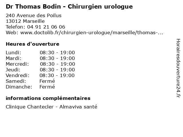 1 Dr Thomas Bodin - Chirurgien urologue (Distance: 6,94 km) 188 Rue du Rouet, 13008 Marseille bodin, chirurgien, dr, médecins, médicaments, santé, secrétariat, spécialiste, thomas, urologue 2 Dr Thomas Bodin - Chirurgien urologue (Distance: 7,32 km) 38 Rue Jean Trinquet, 13002 Marseille bodin, chirurgien, dr, médecin, médecine, médical, pharmaceutique, thomas, traitement, urologue 3 Dr François Breton - Chirurgien urologue - secrétariat (Distance: 0,00 km) 240 Avenue des Poilus, 13012 Marseille breton, chirurgien, consultation, docteur, dr, françois, med, médecin, médecine, secrétariat, traitement, urologue 4 Dr Xavier Breton - Chirurgien urologue (Distance: 0,00 km) 240 Avenue des Poilus, 13012 Marseille breton, chirurgien, dr, médecins, médicaments, santé, secrétariat, spécialiste, urologue, xavier 5 Dr Thomas Rossi - Chirurgien-dentiste (Distance: 2,10 km) 174 Avenue du 24 Avril 1915, 13012 Marseille chirurgien, dentaire, dentiste, dr, implantologie, parodontologie, rossi, thomas 6 Boulangerie Pâtisserie Thomas (Distance: 2,41 km) 3 Boulevard de Compostelle, 13012 Marseille biscuits, boulangerie, chocolats, gâteaux, pâtisserie, thomas |