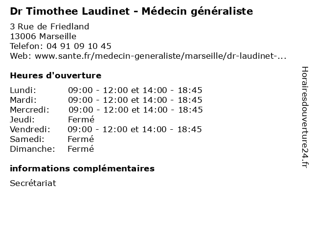 1 Dr Tanguy Devaux - Médecin généraliste (Distance: 0,00 km) 3-5 Rue de Friedland, 13006 Marseille devaux, docteur, dr, generaliste, généraliste, medecin, médecin, soins, tanguy 2 Dr Marie Jadot - Médecin généraliste (Distance: 0,04 km) 3-5 Rue de Friedland, 13006 Marseille docteur, dr, generaliste, généraliste, jadot, marie, medical, médecin, soin 3 Dr Alexandra Chrisment - Médecin généraliste - secrétariat (Distance: 0,36 km) 7 Rue de Gènes, 13006 Marseille alexandra, chrisment, consultation, docteur, dr, généraliste, med, médecin, médecine, secrétariat, traitement 4 Dr Chloé Cardinale - Médecin généraliste (Distance: 0,48 km) 12 Rue St Adrien, 13006 Marseille adrien, cardinale, chloé, docteur, dr, generaliste, généraliste, mds, medical, médecin, pmi, saint, soin 5 Dr Laetitia Giustetto - Médecin généraliste (Distance: 0,48 km) 12 Rue St Adrien, 13003 Marseille adrien, docteur, dr, generaliste, giustetto, généraliste, laetitia, mds, medical, médecin, pmi, saint, soin 6 Dr Eve Gillet Caret - Médecin généraliste (Distance: 0,51 km) 66a Rue Saint-Sébastien, 13006 Marseille caret, docteur, dr, eve, generaliste, gillet, généraliste, mds, medical, médecin, pmi, soin, st, sébastien |