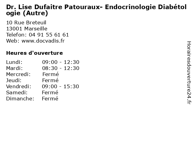 1 Dr. Lise Dufaitre Patouraux- Endocrinologie Diabétologie (Consultation sur rendez-vous) (Distance: 0,00 km) 10 Rue Breteuil, 13001 Marseille consultation, diabétologie, docteur, dr., dufaitre, endocrinologie, lise, patouraux, rendez, santé, sur, vous 2 Maître Lise-Marie Ratouit - Avocate (Distance: 0,23 km) 27-29 rue grignan, 13006 Marseille avocate, avocats, civils, droits, juridiques, lise, marie, maître, ratouit 3 Dr Claire-Lise Sorbier - Gynécologue obstétricien - secrétariat (Distance: 1,71 km) 160 Boulevard Chave, 13005 Marseille claire, consultation, docteur, dr, gynécologue, lise, med, médecin, médecine, obstétricien, secrétariat, sorbier, traitement 4 Dr.Magali Gueydan- Endocrinologie (Distance: 2,09 km) 1 rue Melchior Guinot, 13003 Marseille consultation, docteur, dr.magali, endocrinologie, gueydan, santé 5 Dr Anne Lise Alloin - Pédiatre (Distance: 2,23 km) - Boulevard de Louvain, 13008 Marseille alloin, anne, consultation, docteur, dr, lise, med, médecin, médecine, pédiatre, secrétariat, traitement 6 Dr Lise Dufaitre - Endocrinologue (Distance: 2,30 km) 26 Boulevard de Louvain, 13008 Marseille dr, dufaitre, endocrinologue, lise, médecins, médicaments, santé, secrétariat, spécialiste |