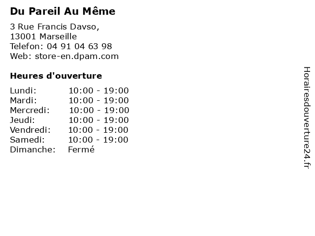 1 Du Pareil Au Même (Distance: 0,09 km) 54 Rue Saint-Ferréol,, 13001 Marseille au, du, enfants.chaussures, lingerie, mode hemmes, mode homme, même, pareil 2 Du Pareil Au Même (Distance: 0,71 km) 23 Rue de la République,, 13002 Marseille au, du, enfants.chaussures, lingerie, mode hemmes, mode homme, même, pareil 3 Du Pareil Au Même (Distance: 0,83 km) , Cc la valentine,, 13923 Marseille au, du, enfants.chaussures, lingerie, mode hemmes, mode homme, même, pareil 4 Du Pareil Au Même (Distance: 0,83 km) bp 147, Cc grand littoral, 13464 Marseille au, du, enfants.chaussures, lingerie, mode hemmes, mode homme, même, pareil 5 Du pareil au même (Distance: 8,17 km) 11 Avenue de Saint Antoine, 13464 Marseille au, beaute, chaussures, deco, du, enfants, mode femmes, mode hommes, même, pareil, restaurant, sport 6 Du Pareil Au Même (Distance: 18,96 km) n/c Chemin de Saint Pierre, 13700 Marignane au, bebe, chaussures, du, fille, garcon, jeans, mode, même, pantalons, pareil, tendances, vetements |